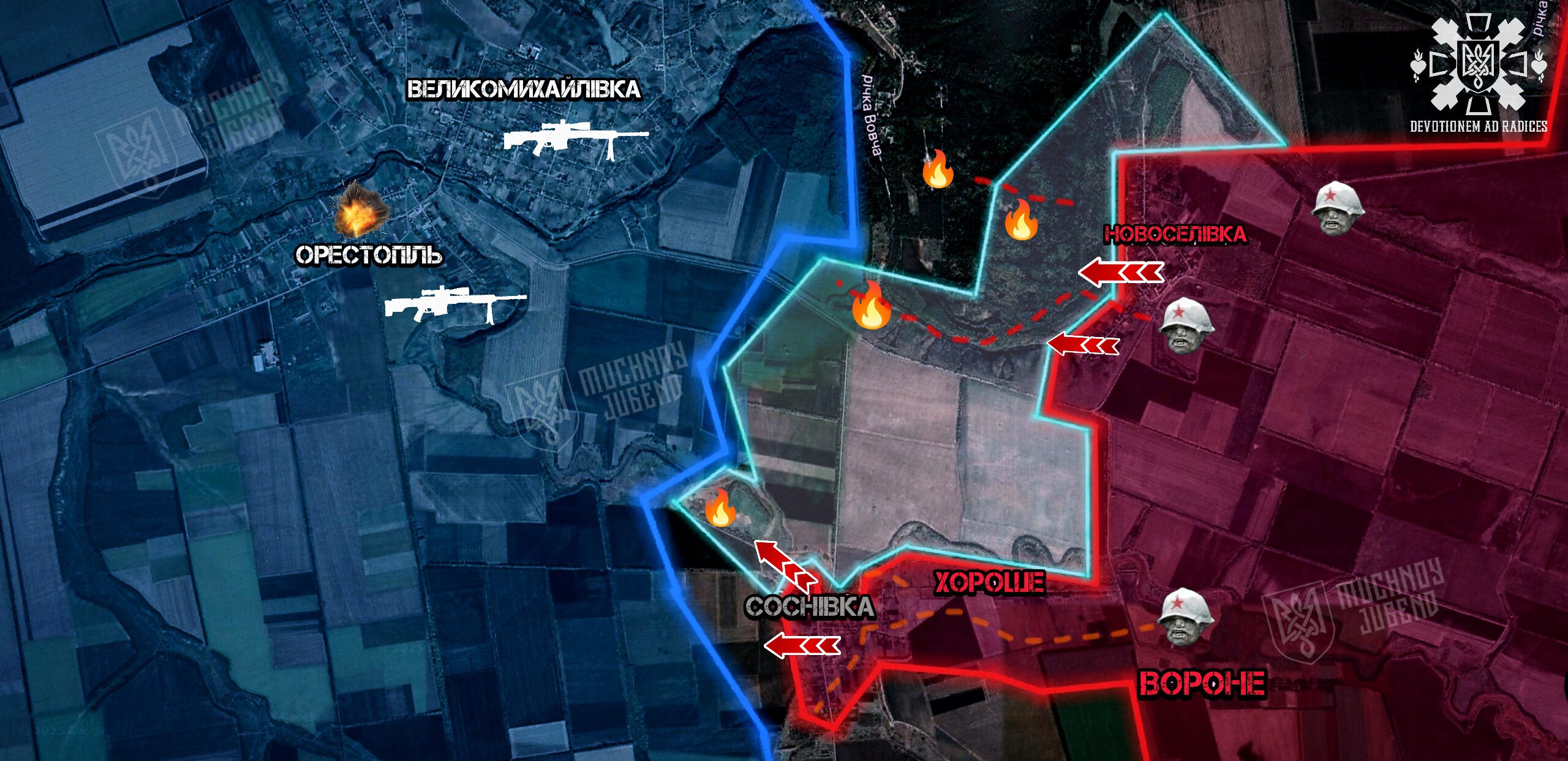 В Днепропетровской области основные бои сосредоточены в районе Сосновки. Село практически разрушено, но РФ продолжает попытки закрепиться. Севернее, вблизи Вороновского заповедника, замечены перемещения россиян, что может указывать на намерение расширить фронт. Серая зона постепенно растягивается в сторону Великомихайловки. Прямых ударов по самому населенному пункту стало меньше, однако это может говорить об активности диверсионных групп.