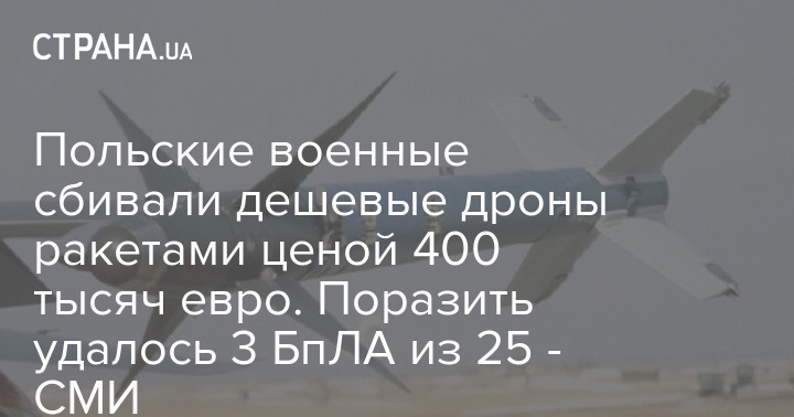 Вчера ночью во время налета беспилотников на Польшу дешевые российские дроны сбивали ракетами стоимостью 400 тысяч евро каждая. При этом точно удалось сбить три БпЛА из 25, четвертый, возможно, упал сам.