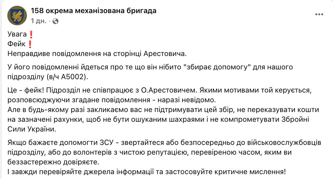 "Это – фейк! Подразделение не сотрудничает с Арестовичем. Какими мотивами он руководствуется, распространяя данное сообщение, – пока неизвестно. Но в любом случае мы призываем вас не поддерживать этот сбор, не переводить деньги на указанные счета, чтобы не быть обманутыми мошенниками и не компрометировать ВСУ", – заявили в бригаде.