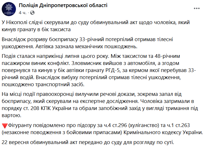 Мстительный пассажир бросил гранату в автомобиль таксиста после ссоры в Никополе