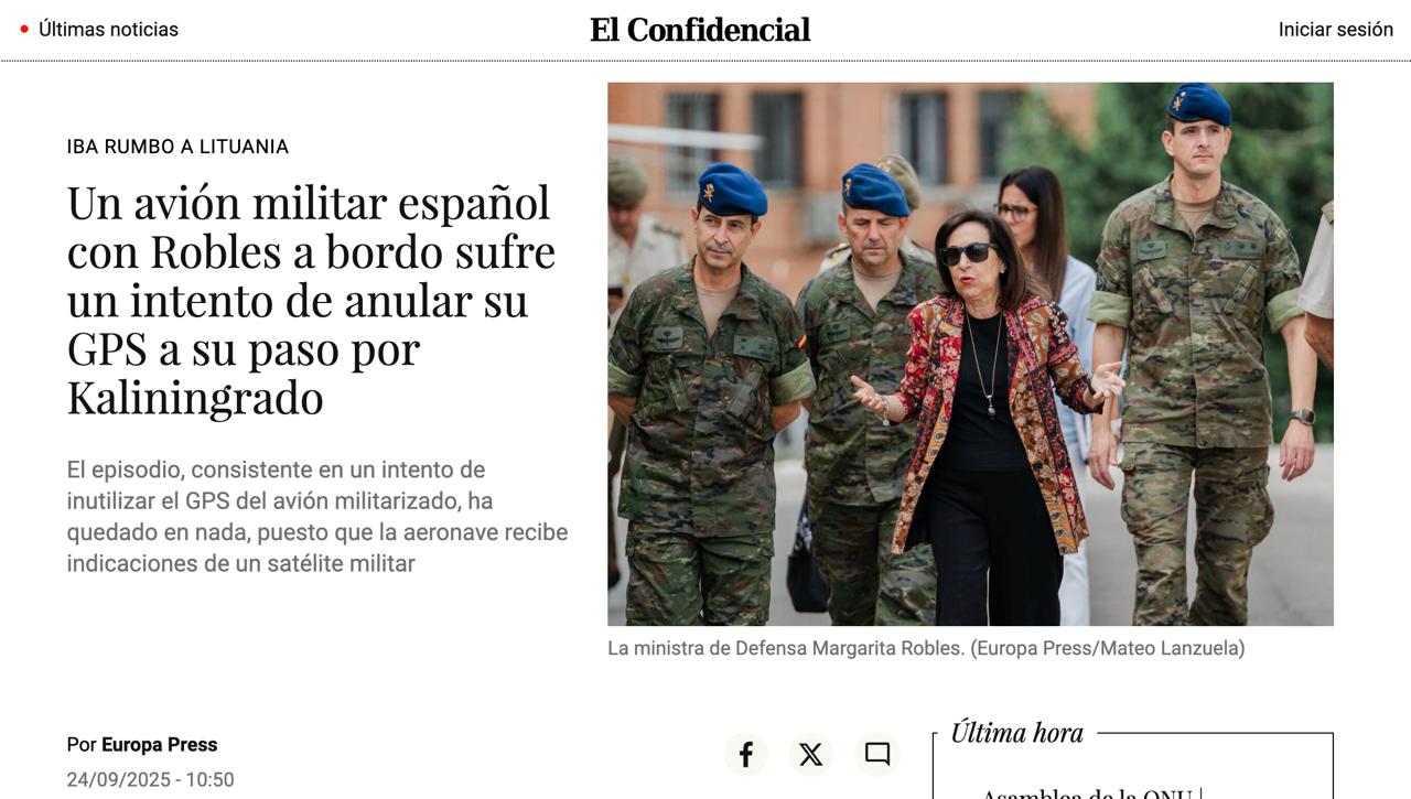 Военный самолет с министром обороны Испании Маргаритой Роблес на борту подвергся попытке нарушить работу его GPS. Инцидент произошел во время пролета судна через российское воздушное пространство близ Калининграда.