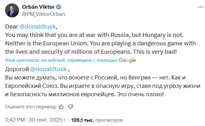 "Вы можете думать, что воюете с Россией, но Венгрия – нет. Как и Европейский союз. Вы играете в опасную игру, ставя под угрозу жизни и безопасность миллионов европейцев. Это очень плохо!" – написал Орбан.