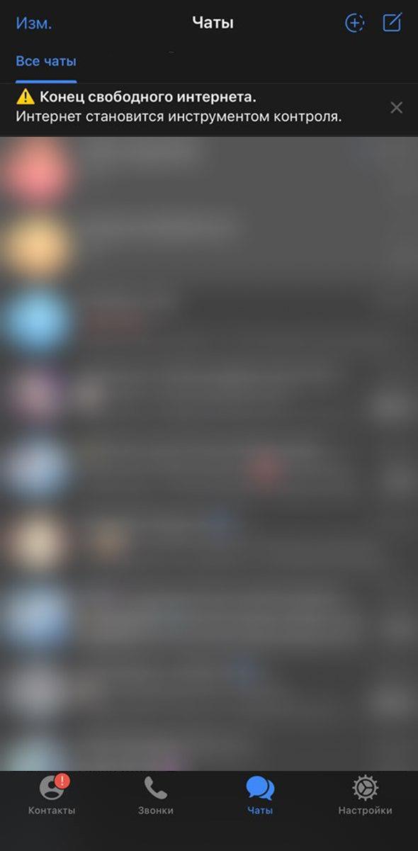 Основатель социальной сети Telegram Павел Дуров поставил свой пост про "конец свободного интернета" плашкой у некоторых пользователей приложения.
