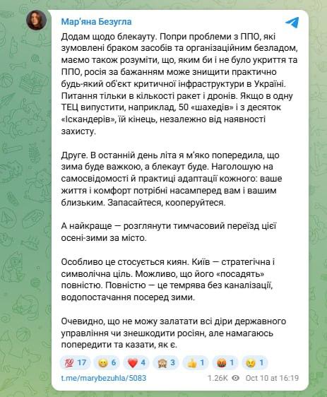 Народный депутат Марьяна Безуглая рекомендует жителям городов Украины, особенно Киева, куда-то переехать на время осени и зимы. Она допускает полный блэкаут.