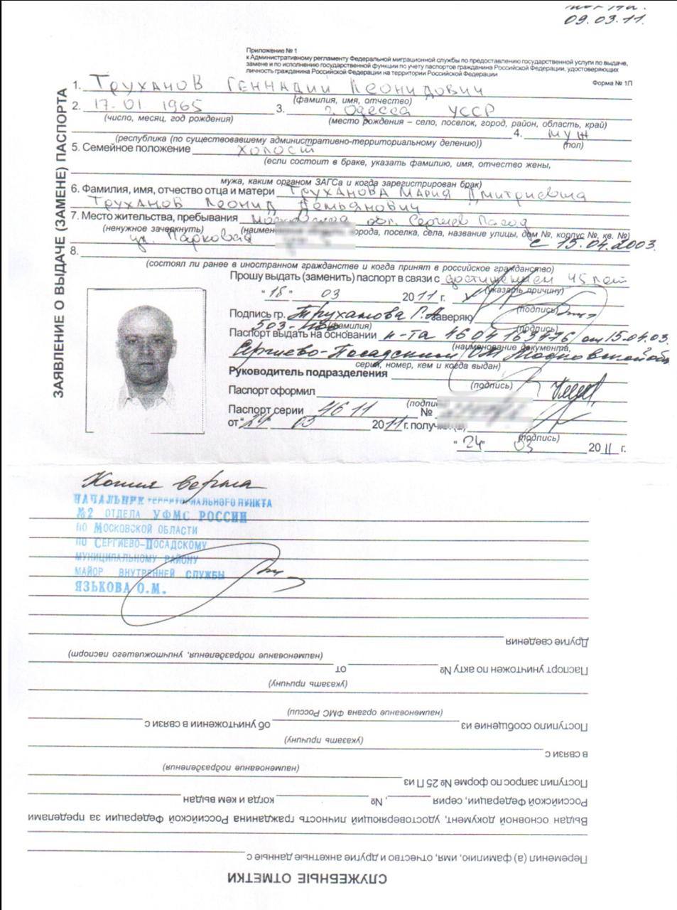 Как пишет The Insider, согласно российским базам данных, у Труханова действительно было два российских паспорта: первый, номер которого начинается с 4604, значится как выданный 15 апреля 2003 года и затем утраченный. Второй, номер которого начинается с цифр 4611, был выдан 24 марта 2011 года ГУ МВД по Московской области "взамен утраченного". В заявлении на выдачу этого паспорта, также имеющемся в распоряжении The Insider, значится "в связи с достижением 45-летнего возраста".