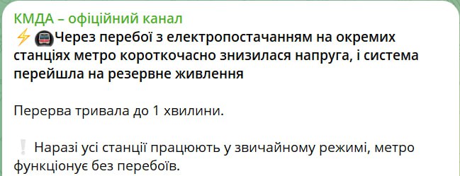 Комментируя информацию об отключениях электроэнергии в метро, в КГГА заявили, что света на станциях не было всего минуту.