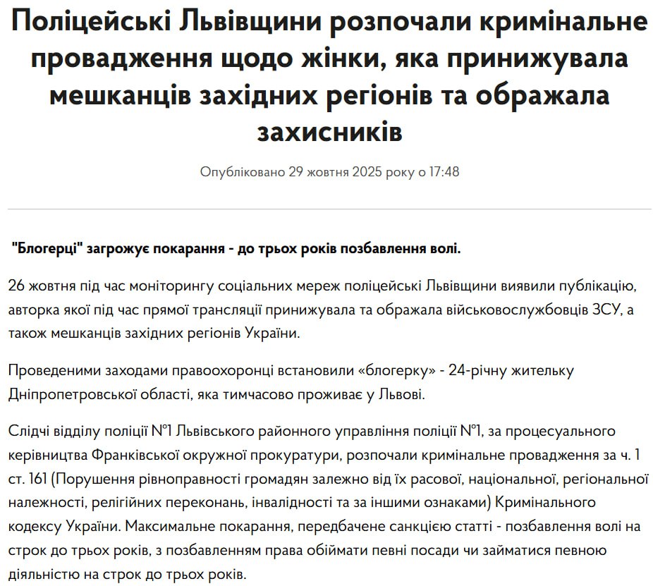 Полиция сообщает, что следователи возбудили уголовное производство по ч. 1 ст. 161 УК – нарушение равноправия граждан по региональной принадлежности. Отметим, что та же статья предусматривает уголовную ответственность за дискриминацию по языковому признаку, на которую жалуются жители восточных регионов, переехавшие на запад Украины.