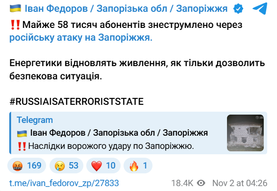В ночь на 2 ноября Россия нанесла удары по объектам гражданской инфраструктуры в Одесской, Запорожской и Днепропетровской областях.