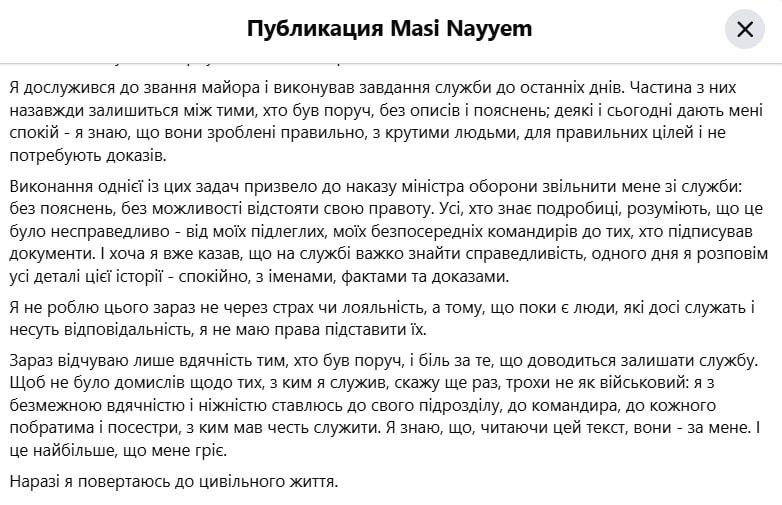 "Выполнение одного из заданий привело к приказу министра обороны уволить меня со службы: без объяснений, без возможности отстоять свою правоту. Все, кто знают подробности, понимают, что это было несправедливо – от моих подчиненных, моих непосредственных командиров до подписывавших документы. И хотя я уже говорил, что на службе трудно найти справедливость, однажды я расскажу все детали этой истории – спокойно, с именами, фактами и доказательствами", - написал Найем, который собирается вернуться к адвокатской практике.