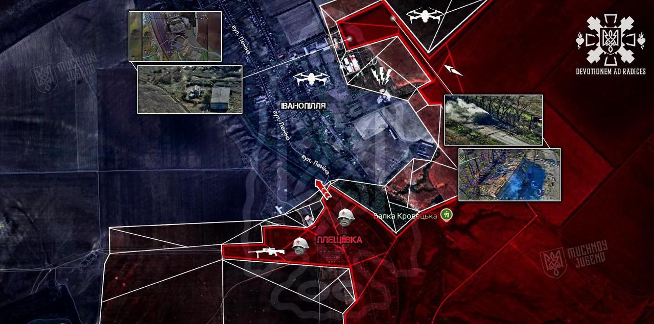 Боец ВСУ "Мучной" в свою очередь обращает внимание на события к югу от города. Там, по его информации, уже практически полностью захвачена Плещеевка (по данным Deep State, это село еще под контролем Украины) и развивается наступление на соседнее Иванополье - за которым начинается южная окраина Константиновки.