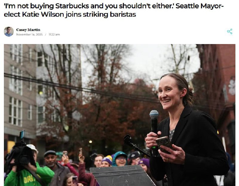 Сразу после победы на выборах она присоединилась к забастовке работников кофеен Starbucks, и призвала к бойкоту этой корпорации.