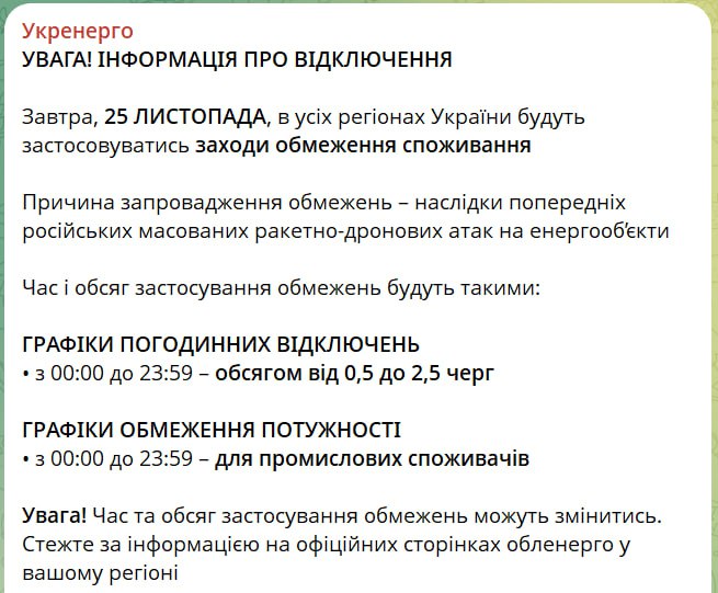 18:05 Отключения света завтра будут во всех регионах – круглосуточно в объеме от 0,5 до 2,5 очередей, сообщает Укрэнерго.