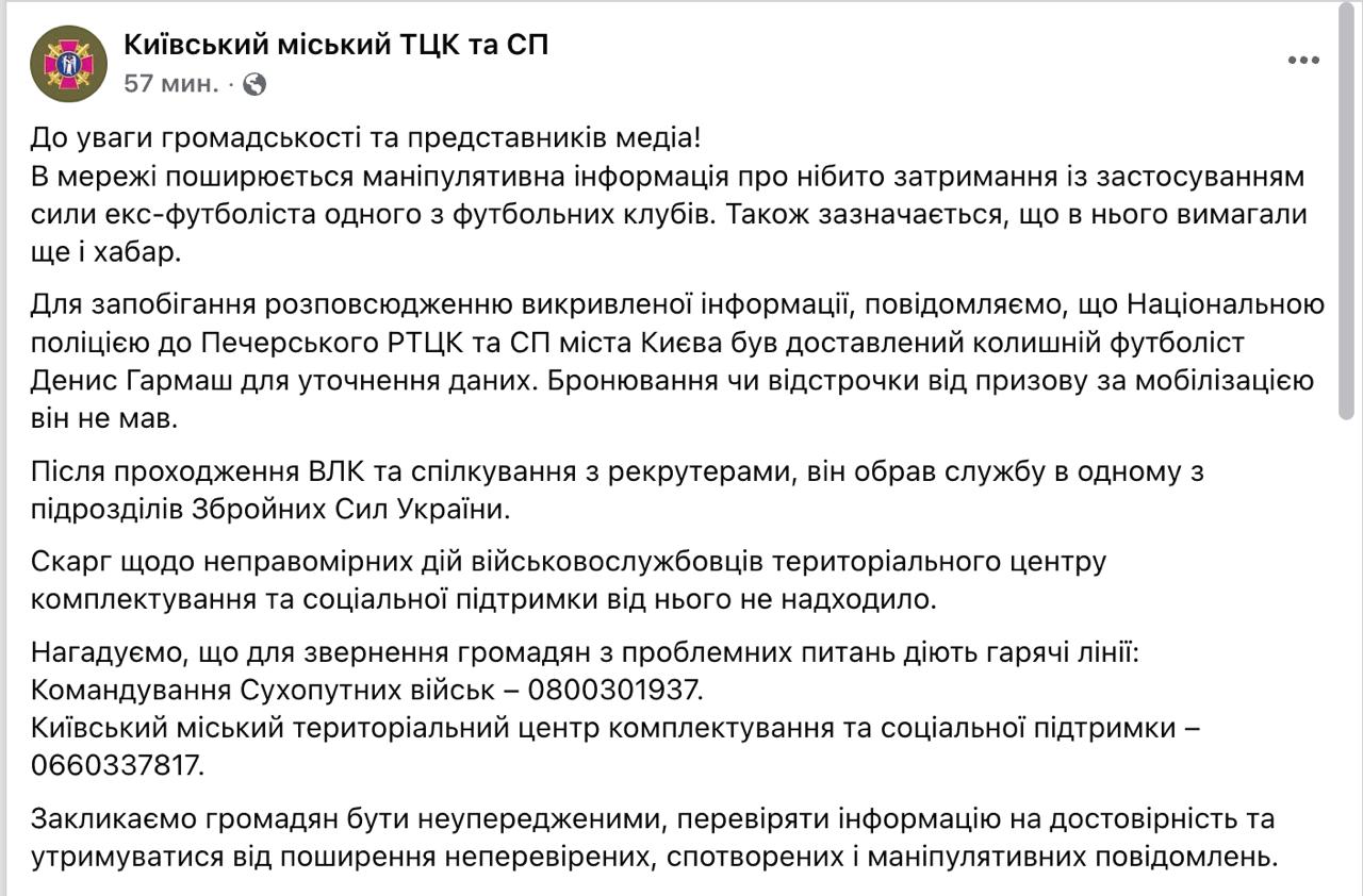 "Вниманию общественности и представителей медиа! В сети распространяется манипулятивная информация о якобы задержании с применением силы экс-футболиста одного из футбольных клубов. Также отмечается, что у него требовали еще и взятку. Для предотвращения распространения искаженной информации, сообщаем, что Национальной полицией в Печерский РТЦК и СП города Киева был доставлен бывший футболист Денис Гармаш для уточнения данных. Бронирования или отсрочки от призыва по мобилизации у него не было. После прохождения ВЛК и общения с рекрутерами он выбрал службу в одном из подразделений Вооруженных Сил Украины. Жалоб по поводу неправомерных действий военнослужащих территориального центра комплектования и социальной поддержки от него не поступало", – говорится в заявлении.