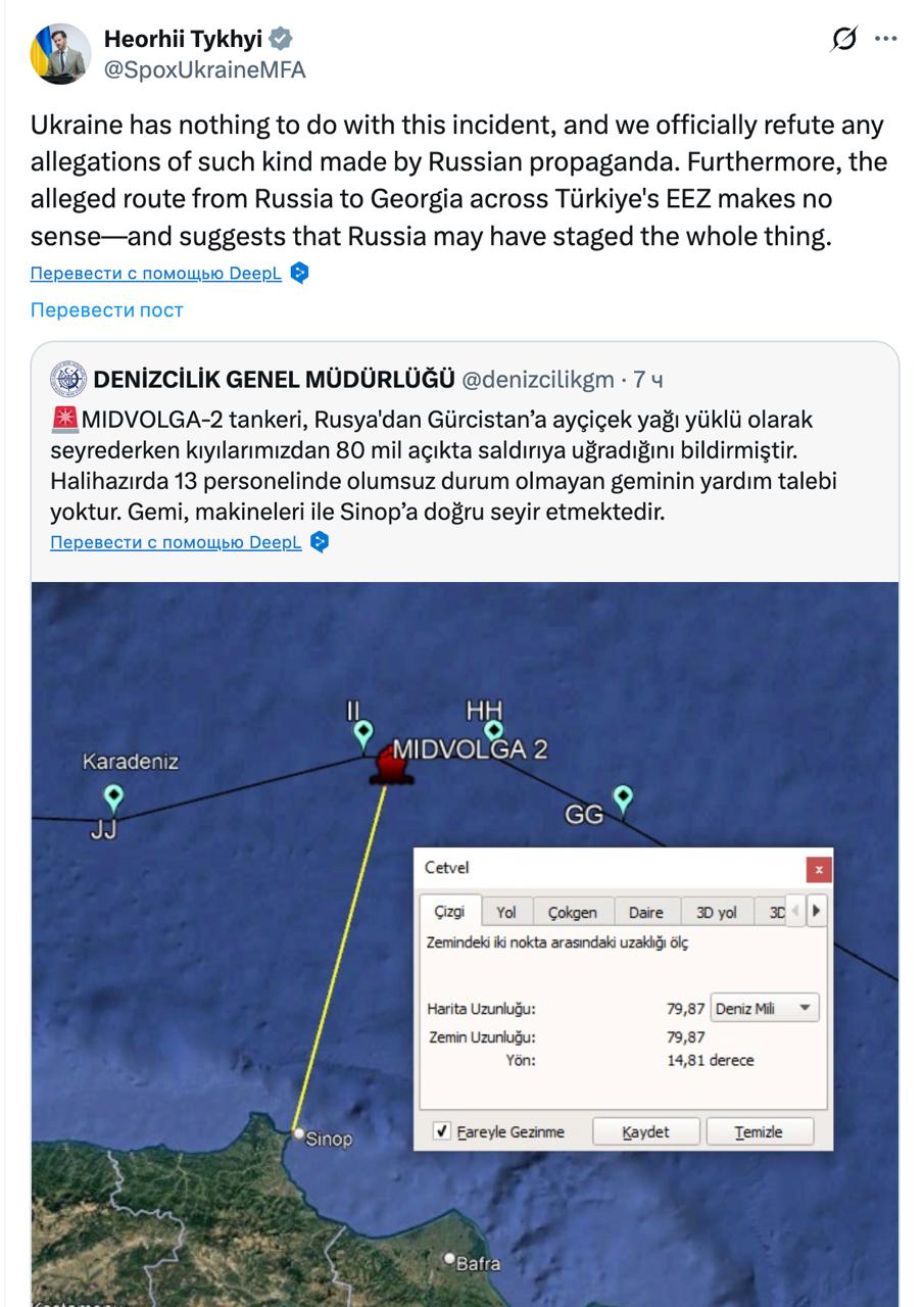 "Украина не имеет никакого отношения к этому инциденту, и мы официально опровергаем любые подобные утверждения российской пропаганды. Более того, предполагаемый маршрут из России в Грузию через исключительную экономическую зону Турции не имеет смысла и позволяет предположить, что Россия могла инсценировать все это", - заявил Тихий.