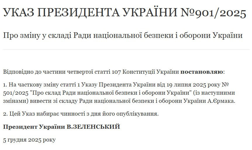 "На частичное изменение статьи 1 Указа Президента Украины от 19 июля 2025 года № 501/2025 "О составе Совета национальной безопасности и обороны Украины" (с последующими изменениями) вывести из состава Совета национальной безопасности и обороны Украины А.Ермака", — говорится в Указе.