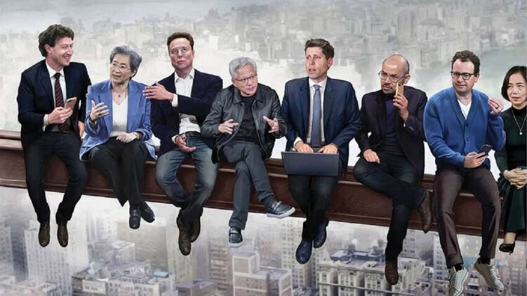 Журнал поместил "архитекторов ИИ" на обложку. Все они сидят на стальной балке, а изображение отсылает к знаменитой фотографии "Обед на небоскрёбе" 1932 года.