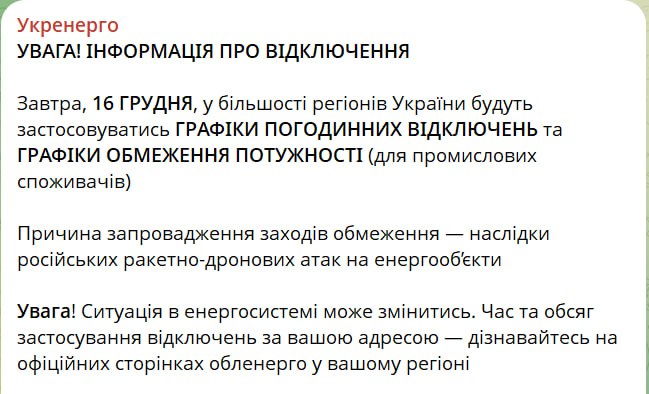 19.14 Свет завтра будут отключать не во всех областях, сообщает Укрэнерго.