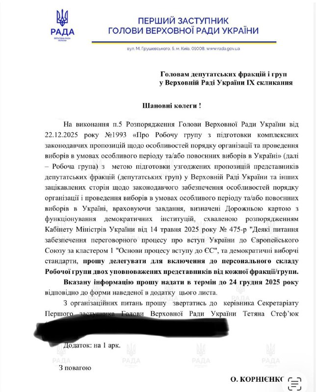 Между тем нардеп из "Голоса" Ярослав Железняк опубликовал письмо с приглашением фракцияи и группам Рады от вице-спикера Александра Корниенко предоставить до 24 декабря по два представителя в упомянутую Арахамией рабочую группу.