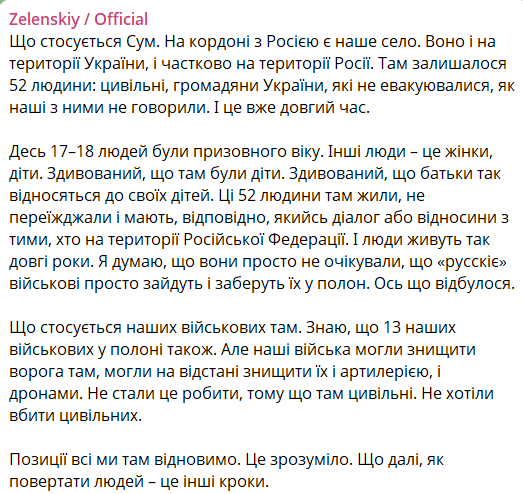 "Где-то 17-18 человек были призывными. Другие люди – это женщины, дети... Эти 52 человека там жили, не переезжали и имеют соответственно какой-то диалог или отношения с теми, кто на территории Российской Федерации. И люди живут столь долгие годы. Я думаю, что они просто не ожидали, что российские военные просто зайдут и заберут их в плен. Что касается наших военных там. Знаю, что 13 наших военных в плену тоже", – написал Зеленский.