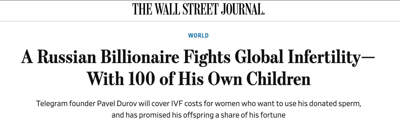 Основатель мессенджера Telegram Павел Дуров готов оплатить расходы на экстракорпоральное оплодотворение (ЭКО) для всех незамужних женщин моложе 38 лет, желающих использовать его донорскую сперму для оплодотворения, и обещает своим детям долю от своего состояния, которое оценивается в 17 миллионов долларов.