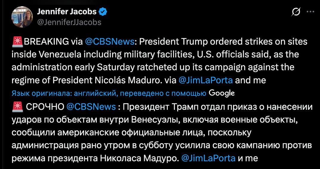 9:36 Трамп отдал приказ о нанесении ударов по объектам Венесуэлы, включая военные.