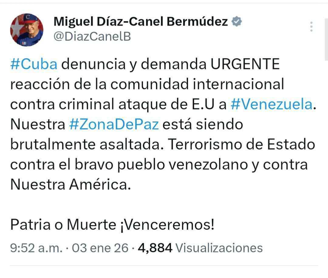 10:30 Президент Кубы Мигель Диас-Канель обвинил США в нападении на Венесуэлу. Он заявил, что Гавана  требует срочной реакции мира на "преступную атаку США на Венесуэлу".