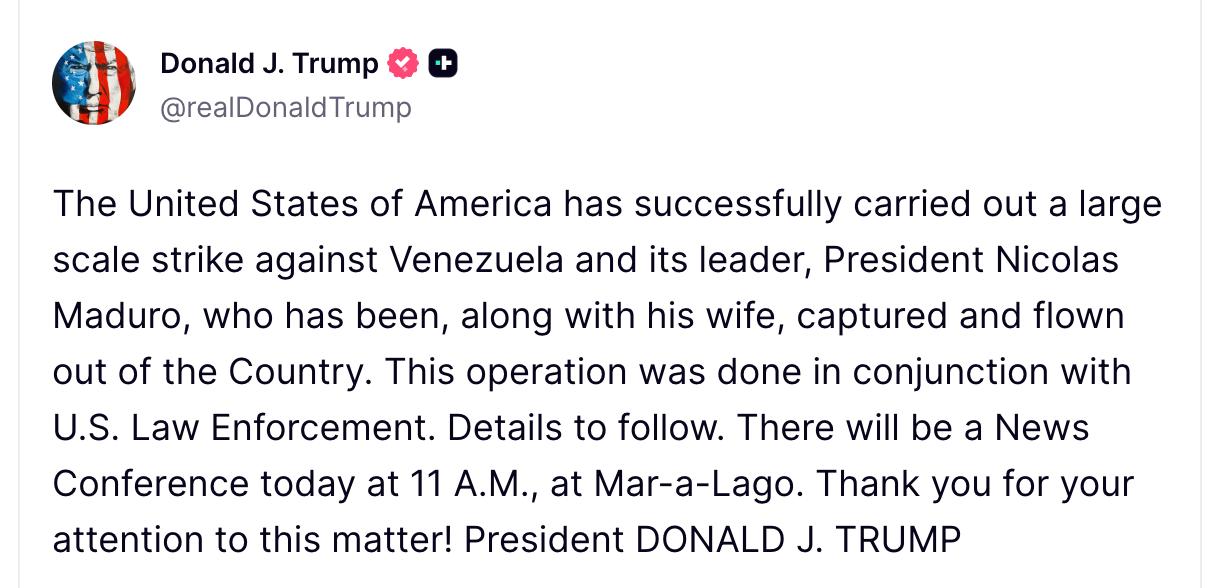 11:42 "Соединенные Штаты Америки успешно провели масштабный удар по Венесуэле и её лидеру, президенту Николасу Мадуро, который вместе с женой был захвачен и вывезен из страны. Эта операция проводилась совместно с правоохранительными органами США. Подробности будут позже. Сегодня в 11 утра в Мар-а-Лаго (в 18:00 по Киеву - Ред.) состоится пресс-конференция", - написал президент США.
