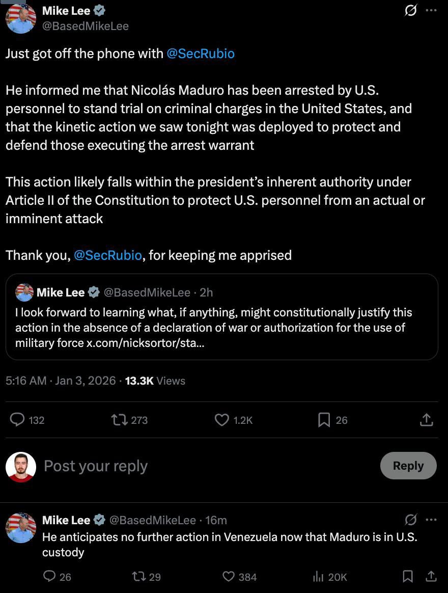 12:37 США не планируют дальнейших действий в Венесуэле после задержания Николаса Мадуро, заявил сенатор Майк Ли.