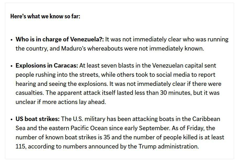 8:44 CNN подтверждает множественные взрывы в столице Венесуэлы и заявляет, что в Каракасе слышна работа авиации.