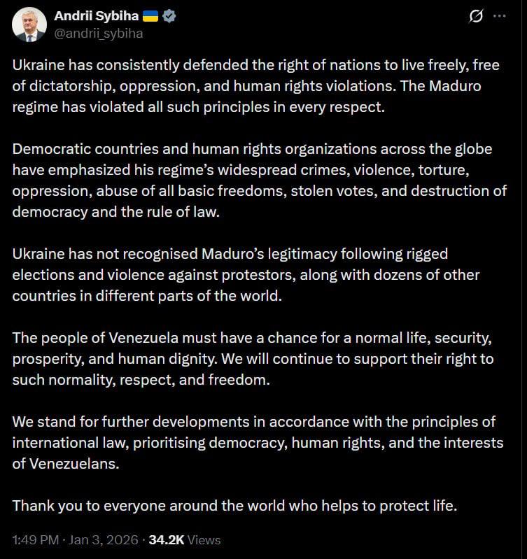 "Украина, как и десятки других стран в разных частях света, не признала легитимность Мадуро после сфальсифицированных выборов и насилия в отношении протестующих. Народ Венесуэлы должен иметь возможность жить нормальной жизнью, в безопасности, процветании и с человеческим достоинством. Мы будем и дальше поддерживать их право на такую ​​нормальную жизнь, уважение и свободу.