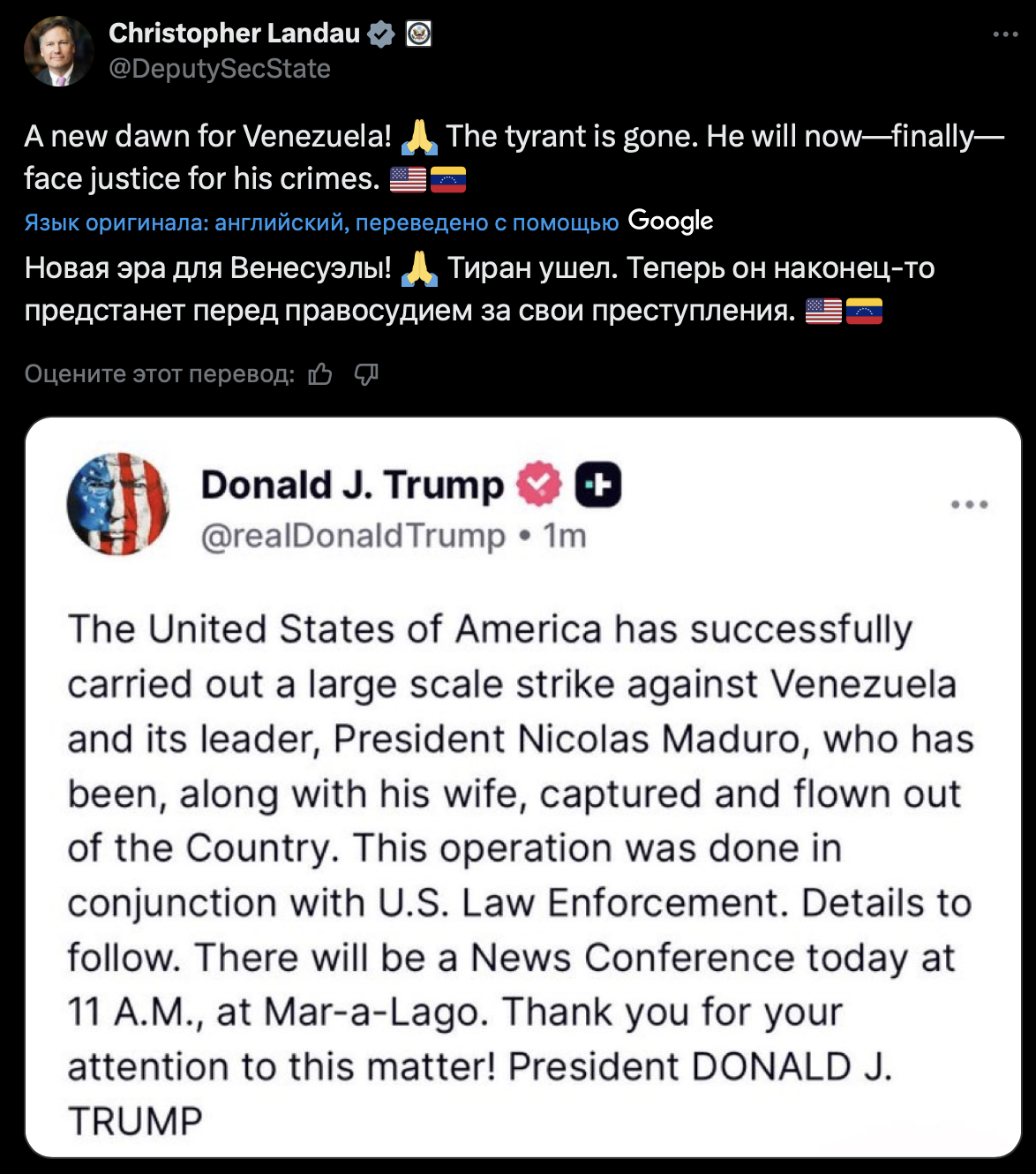 "Новый рассвет для Венесуэлы! Тиран ушел. Теперь он, наконец, предстанет перед правосудием за свои преступления", — указал он.