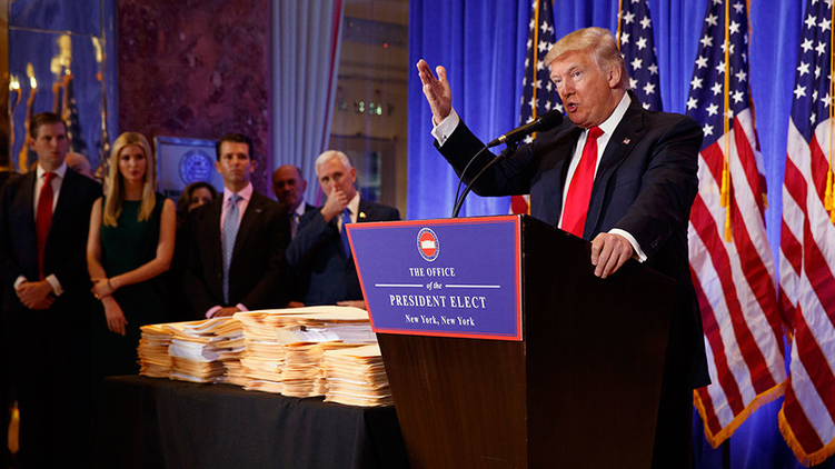 Избранный президент США Дональд Трамп сегодня в своей резиденции Trump-Tower в Нью-Йорке дал первую большую пресс-конференцию после своей победы на выборах и с июля прошлого года вообще.