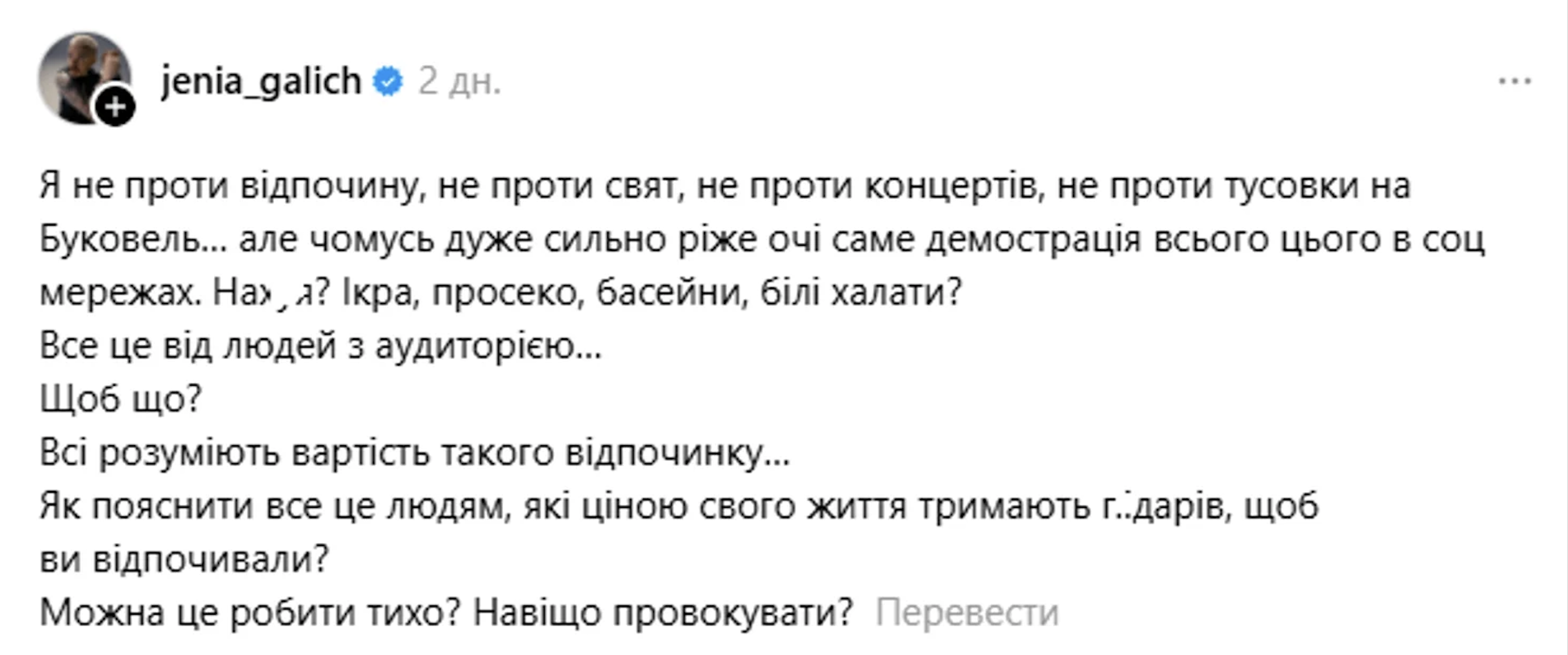 "Я не против отдыха, не против праздников, не против концертов, не против тусовки в Буковеле, но почему-то очень сильно режет глаза именно демонстрация всего этого в социальных сетях. Нах@я? Икра, просекко, бассейны?..  Все понимают стоимость такого отдыха. Как объяснить всё это людям, которые ценой своей жизни держат пидаров, чтобы вы отдыхали? Можно это делать тихо? Зачем провоцировать?" – написал он в Threads.