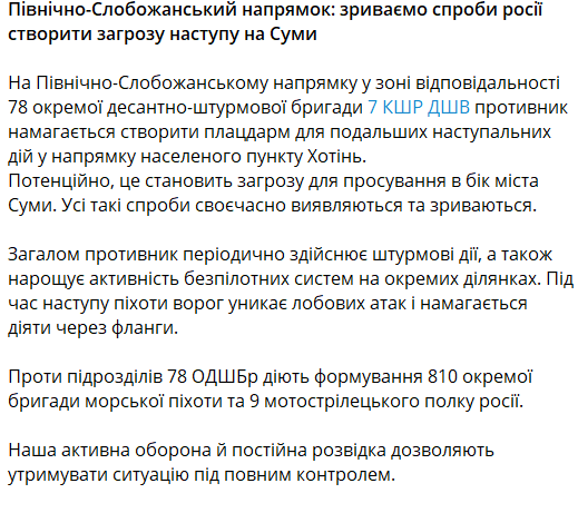 По оценке военных, наступление сейчас ведется в направлении поселка Хотень, что в перспективе создает опасность наступления непосредственно на Сумы.