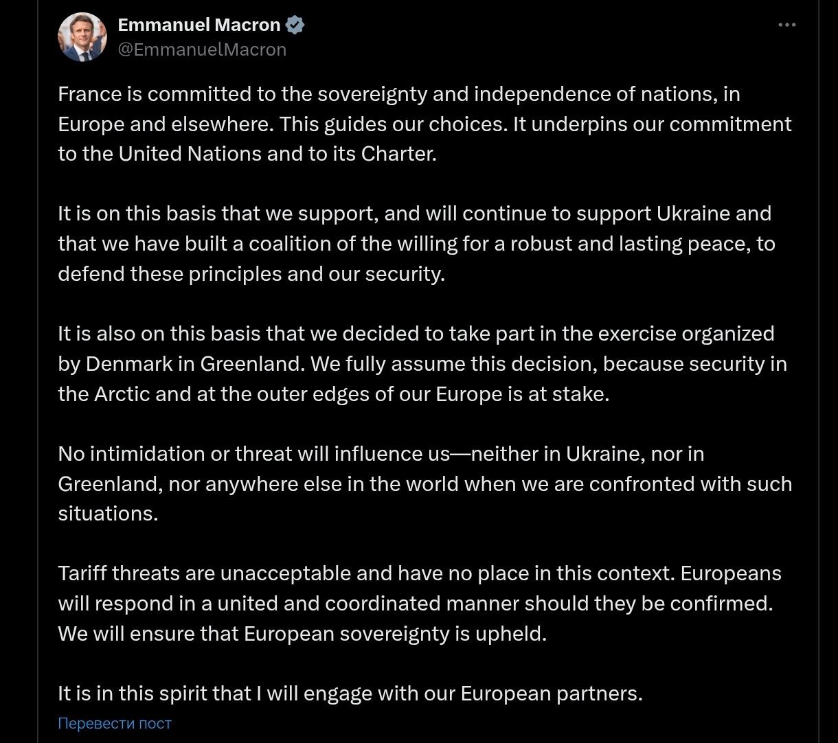 "Никакое запугивание или угрозы не смогут повлиять на нас - ни в Украине, ни в Гренландии, ни где-либо еще в мире, когда мы столкнемся с подобными ситуациями. Угрозы введения тарифов неприемлемы и недопустимы в данном контексте. В случае подтверждения таких угроз европейцы отреагируют единым и скоординированным образом", - добавил Макрон.