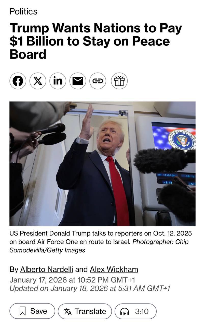 "Американский чиновник подтвердил агентству Bloomberg News, что, хотя вступление в организацию будет бесплатным, взнос в размере 1 миллиарда долларов обеспечит постоянное членство. Собранные средства будут использованы непосредственно для выполнения мандата Совета мира по восстановлению Газы, заявил чиновник, говоривший на условиях анонимности. Совет обеспечит использование почти каждого собранного доллара для выполнения своего мандата, добавил чиновник", - пишет Bloomberg.