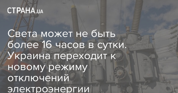 Украина переходит к режиму отключений света, при котором электроснабжения у бытовых потребителей может не быть более 16 часов в сутки. Новый график будет предполагать 4,5-5 очередей плановых отключений.