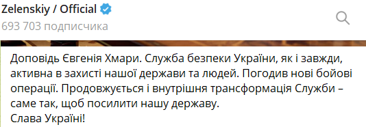 Перед этим Зеленский назначил Евгения Хмару исполняющим обязанности главы СБУ. Бывший пресс-секретарь СБУ Станислав Речинский сообщал, что Хмара - "автор и организатор дроновых атак" на Россию, в том числе операции "Паутина" - атаки на стратегическую авиацию РФ.