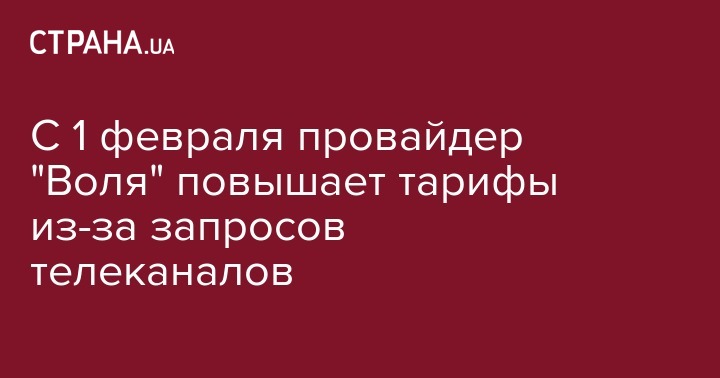 Украинский провайдер компания "Воля" с 1 февраля повышает тарифы на пакеты услуг ТВ, Интернет, ТВ+Интернет. Об этом сообщается на сайте компании.