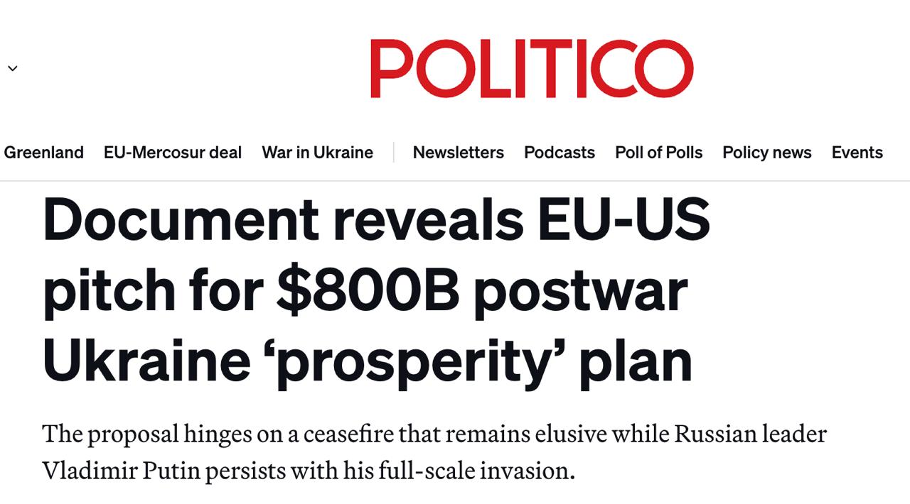 Politico сообщает подробности плана США и Европейского Союза о 800 млрд долл. инвестиций в Украину после войны и ускоренном членстве в ЕС.
