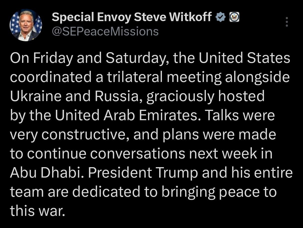 Между тем американский новостной портал Axios со ссылкой на американских чиновников пишет, что трёхсторонние переговоры США, России и Украины в Абу-Даби были продуктивными и позволили приблизится к урегулированию российско-украинской войны.