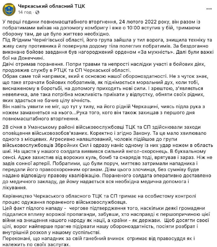 12:48 В Умани мужчина ударил ножом в шею сотрудника ТЦК, сообщает областной военкомат.