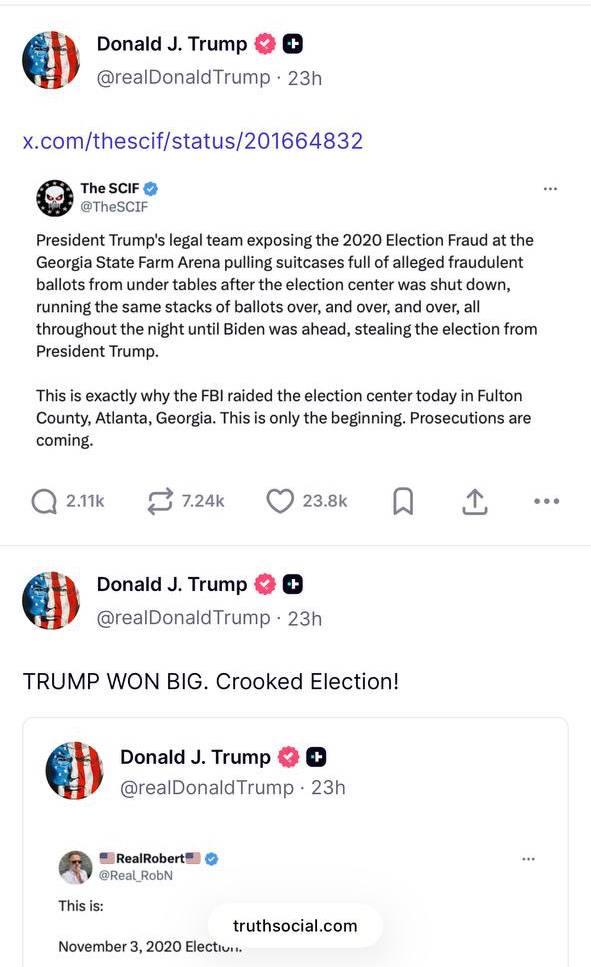 Обыскам ФБР в Атланте Трамп посвятил более десятка постов в своей соцсети Truth Social.