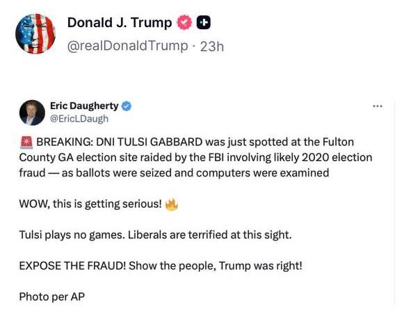 В ходе обысков были изъяты 700 ящиков с бюллетенями, заявила член совета округа Фултон. На месте обысков присутствовала директор Национальной разведки Тулси Габбард.