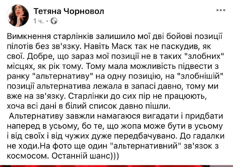 "Выключение "Старлинков" оставило мои две боевые позиции пилотов без связи. Даже Маск так не гадил, как свои. Хорошо, что сейчас мои позиции не в таких "злобных" местах, как год назад. Поэтому имела возможность подвести с утра альтернативу на одну позицию, на более "злобной" позиции альтернатива лежала в запасе давно, поэтому мы уже на связи. "Старлинки" до сих пор не работают, хотя все данные в белый список давно пошли", - рассказала Черновол.