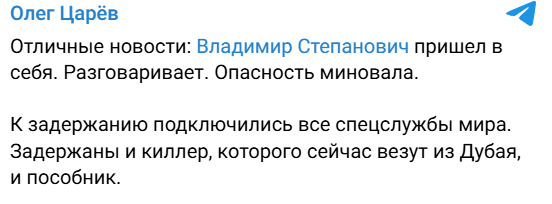 "Отличные новости: Владимир Степанович пришел в себя. Разговаривает. Опасность миновала", - пишет Царев.
