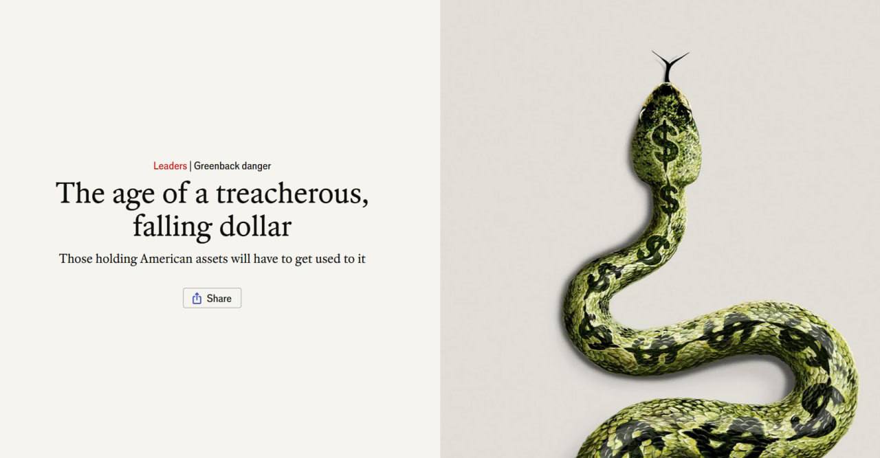 В качестве опасности для доллара The Economist называет огромный американский госдолг и жесткую политику президента США Дональда Трампа по санкциям, из-за которой подрывается доверие к доллару как к универсальной резервной валюте.