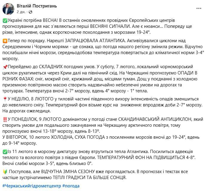 В понедельник 9 февраля доминантом в погоде станет сканднавский антициклон, который создаст условия для дальнейшей закачки на Черкасщину арктического воздуха, поэтому прогнозируем ночью 13-18º мороза, днем ​​8-13º. Во вторник, 10 февраля холодная, сухая погода с усилением морозов ночью до 19-24°, днем ​​до 9-14° мороза. С 11 февраля в морозную диктатуру снова вмешается теплая Атлантика. Усилится адвекция теплого и влажного воздуха с юга Европы. Температурный фон повысится повысится 4-8°. Ночью слабые морозы 3-5°, днем ​​около 0°", - пишет Постригань.