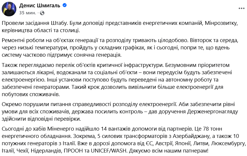 Шмыгаль сообщил, что провел заседание штаба по ликвидации последствий российских обстрелов энергетики. По его словам, ремонтные работы на энергетических объектах продолжаются круглосуточно.