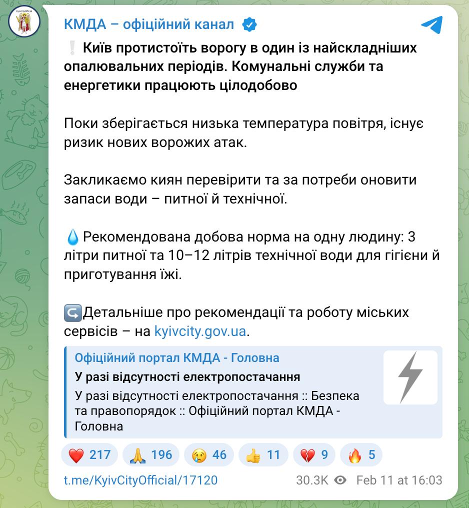 "Пока сохраняется низкая температура воздуха, существует риск новых вражеских атак. Призываем киевлян проверить и при необходимости обновить запасы воды – питьевой и технической", - говорится в сообщении.